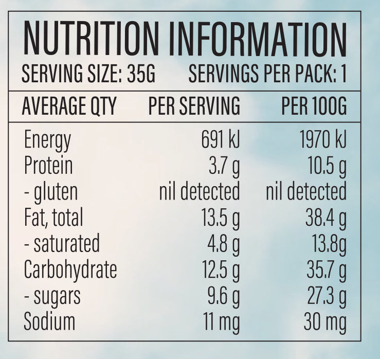 Australian almonds (36.4%), *cacao paste, *coconut blossom sugar, *cacao butter, *brown rice syrup, *coconut milk, wild crafted astragalus (1%), caramel extract (0.01%), Australian sea salt, *blue corn flower petal, *tamari (soy). [Cacao solids 25%]. *Organic. Contains: almonds and soy. May be present: sesame, peanut, pecan, hazelnut, macadamia, cashew, pistachio.