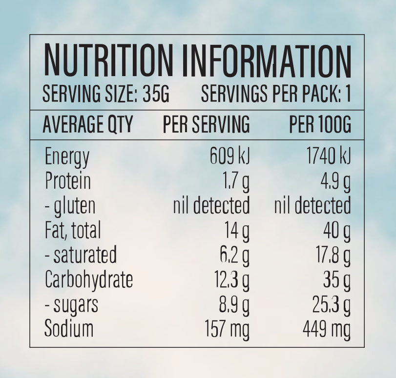 *cacao paste, *coconut blossom sugar, *cacao butter, *brown rice syrup, macadamia (22%), *coconut milk, *maple syrup (2%), olive oil, caramel extract (mct based) (<1%), Australian sea salt, [Cacao solids 48.5%]. *Organic. Contains: macadamias. May be present: sesame, peanut, almond, hazelnut, pecan, cashew, pistachio.