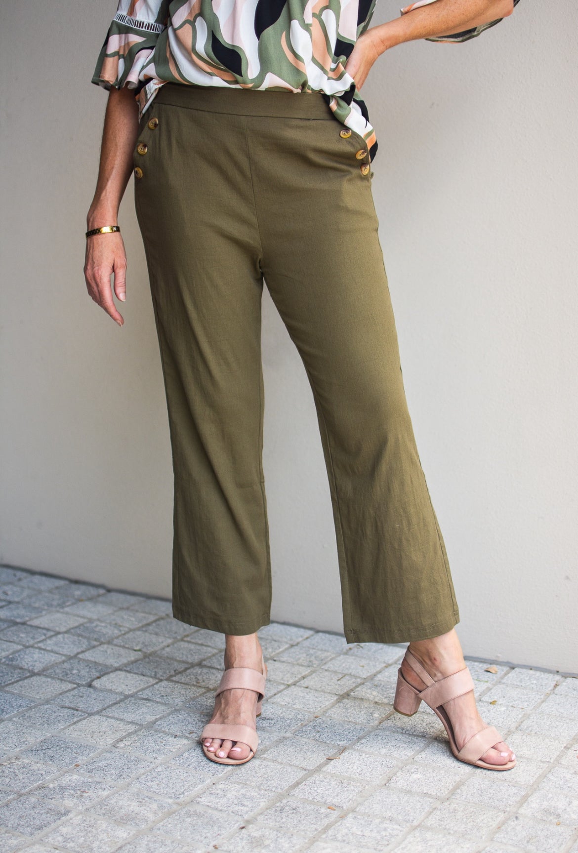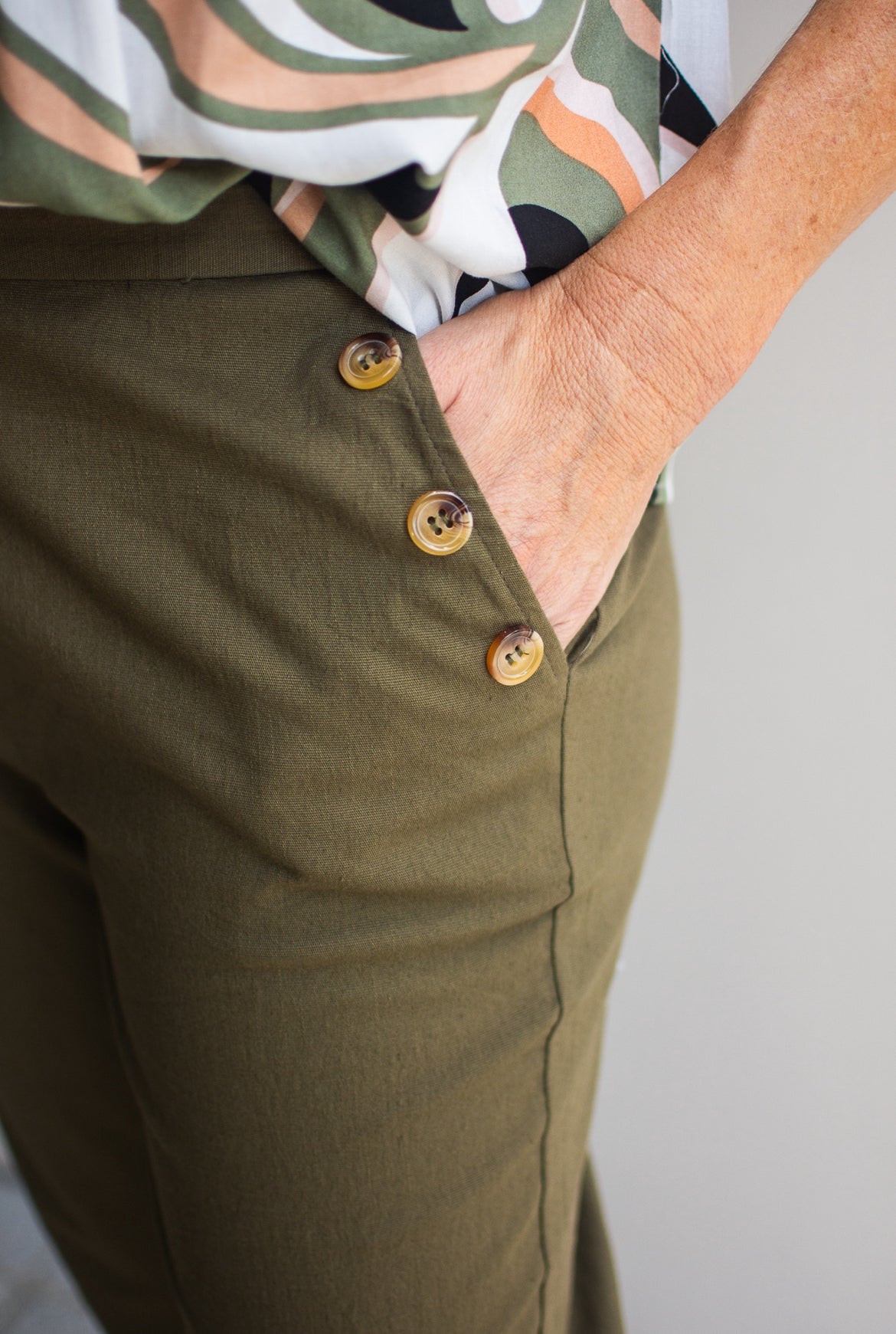 Linen/Rayon stretch pant, featuring button pocket details.