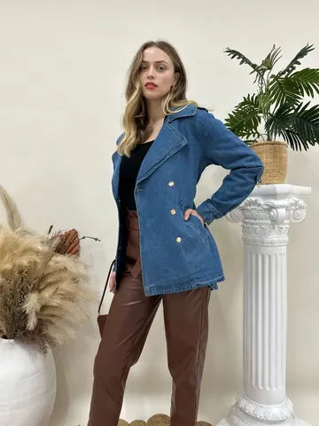 Crafted from 100% soft cotton denim, this jacket features a flattering belted waist, double-breasted buttons, and adjustable sleeve ties for versatile styling.