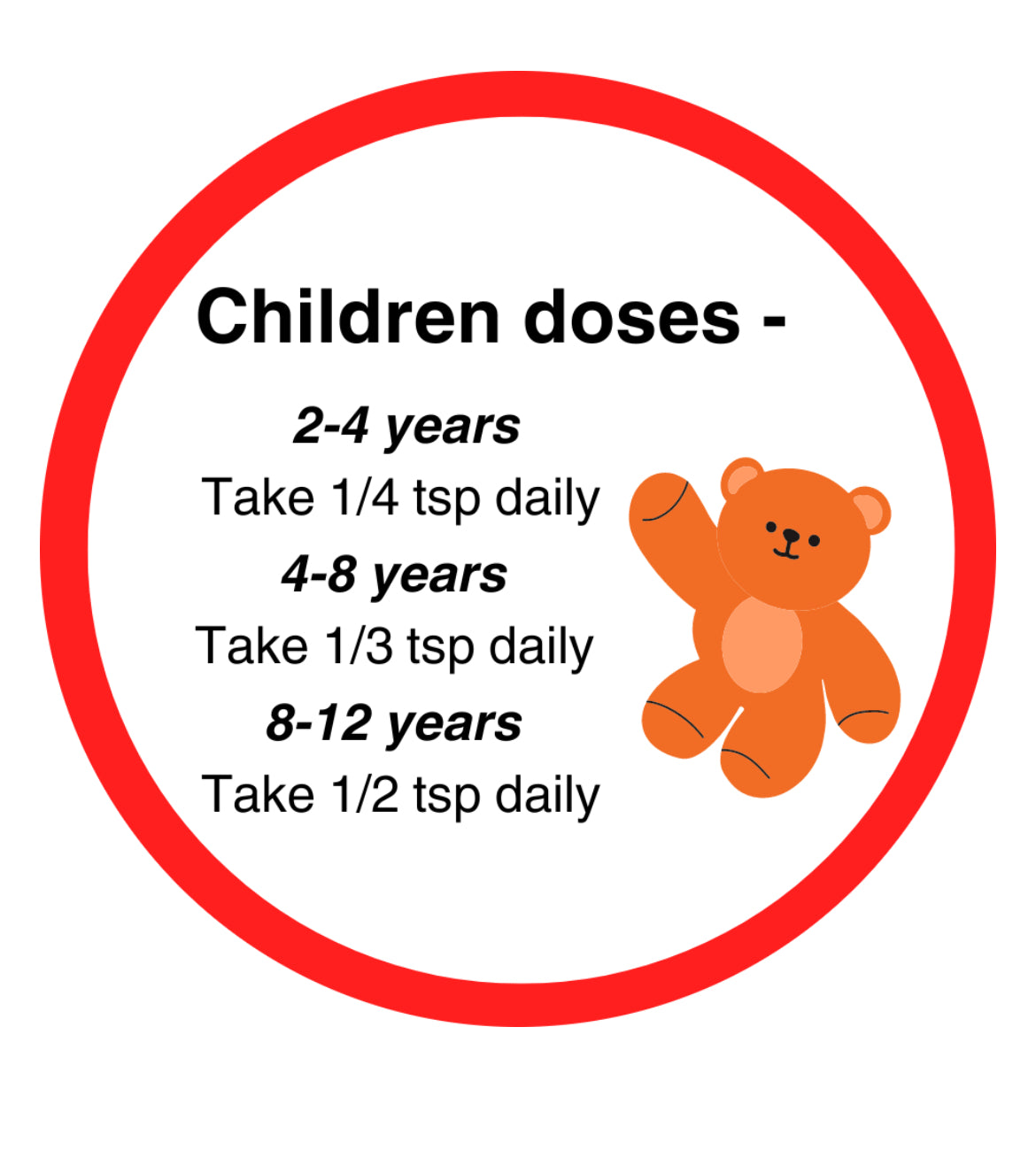 - Children: 1/4 teaspoon daily, added to water or juice.