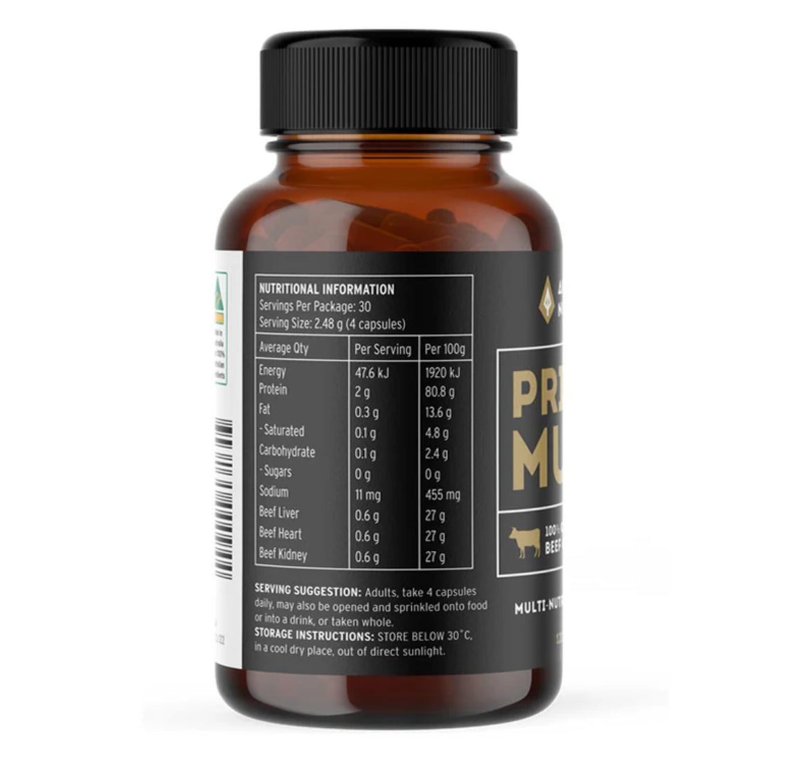 Per Serve 2.48g Energy 47.6 KJ Protein 2g Fat 0.3g - Saturated 0.1g Carbohydrates 0.1g - Sugars 0g Sodium 11mg Vitamin B12 3.06mcg Vitamin A 82mcg Vitamins 2.48g Vitamin B3 (Niacin) 620mcg Vitamin B5 (Pantothenic acid) 400mcg Vitamin B2 (Riboflavin) 120mcg Vitamin B1 (Thiamin) 30mcg Vitamin B6 (Pyridoxine) 20mcg Vitamin B9 (Folate) 10mcg Vitamin D 0.41IU Vitamin K2 0.70mcg Minerals 2.48g Copper 140mcg Heme Iron 430mcg Magnesium 1.51mg Phosphorus 21.28mg Potasium 22.05mg Selenium 3.9mcg Sodium 9.12mg Zinc 160mcg Choline 22.5mg Ingredients: 83% Australian Beef Organs [Beef Liver 166mg, Beef Kidney 166mg, Beef Heart 167mg] 500mg), 17% Bovine Gelatin Capsule (120mg)