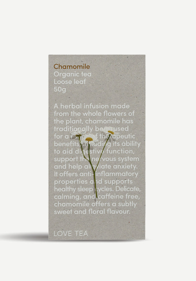 A herbal infusion made from the whole flowers of the plant, chamomile has traditionally been used for a range of therapeutic benefits, including its ability to aid digestive function, support the nervous system and help alleviate anxiety. It offers anti–inflammatory properties and supports healthy sleep cycles. Delicate, calming, and caffeine free, chamomile offers a subtly sweet and floral flavour.