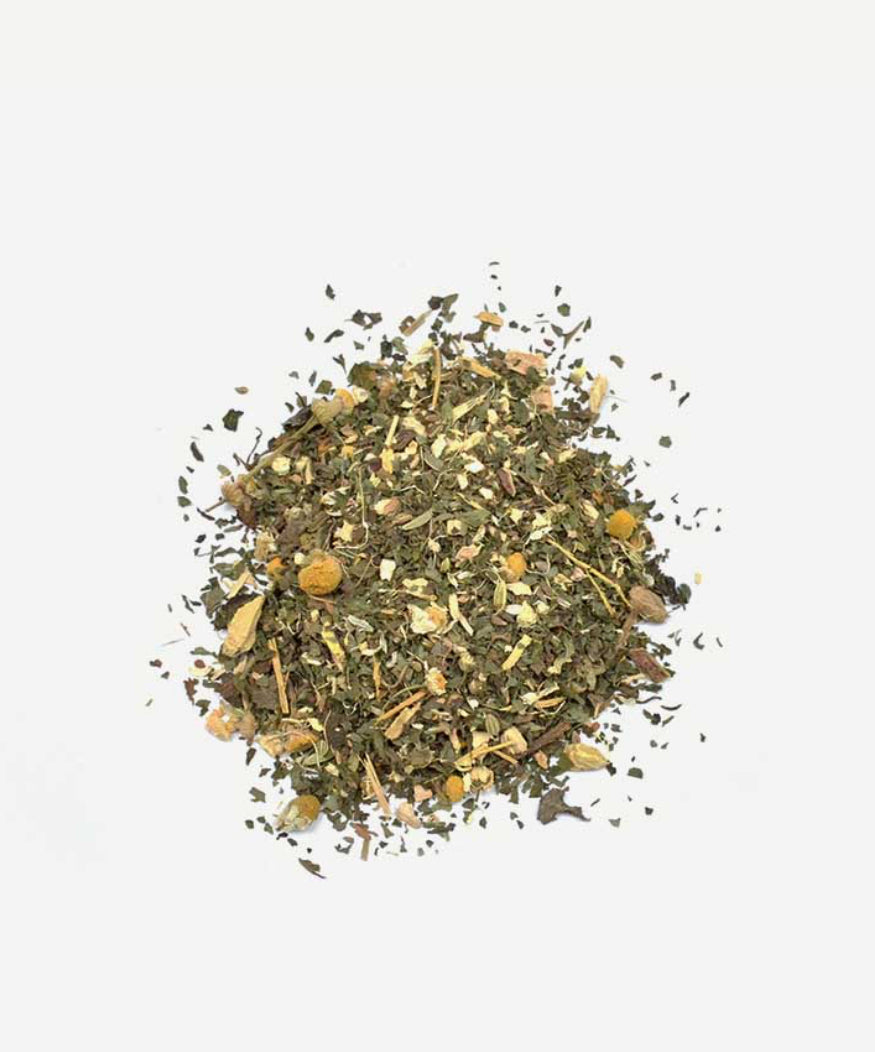 Peppermint (Mentha piperita), Ginger (Zingiber officinale)*, Licorice Root (Glycyrrhiza Glabra), Aniseed (Pimpinella anisum), Lemon Balm (Melissa officinalis), Fennel (Foeniculum vulgare), Chamomile (Matricaria chamomilla)