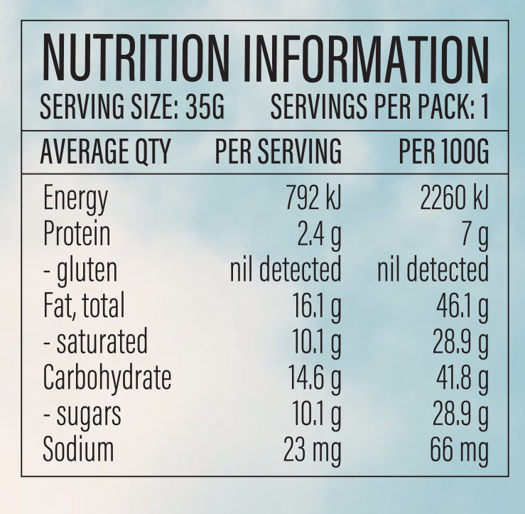 *cacao paste, *coconut blossom sugar, *cacao butter, *tahini (sesame), *coconut oil, sour cherries (apple juice, sunflower oil) (7.2%), *freeze dried raspberries (3.2%), schisandra berry (2%), black cherry oil (0.1%). [Cacao solids 57.7%]. *Organic. Contains: sesame. May be present: peanut, almond, hazelnut, macadamia, cashew, pistachio, pecan.