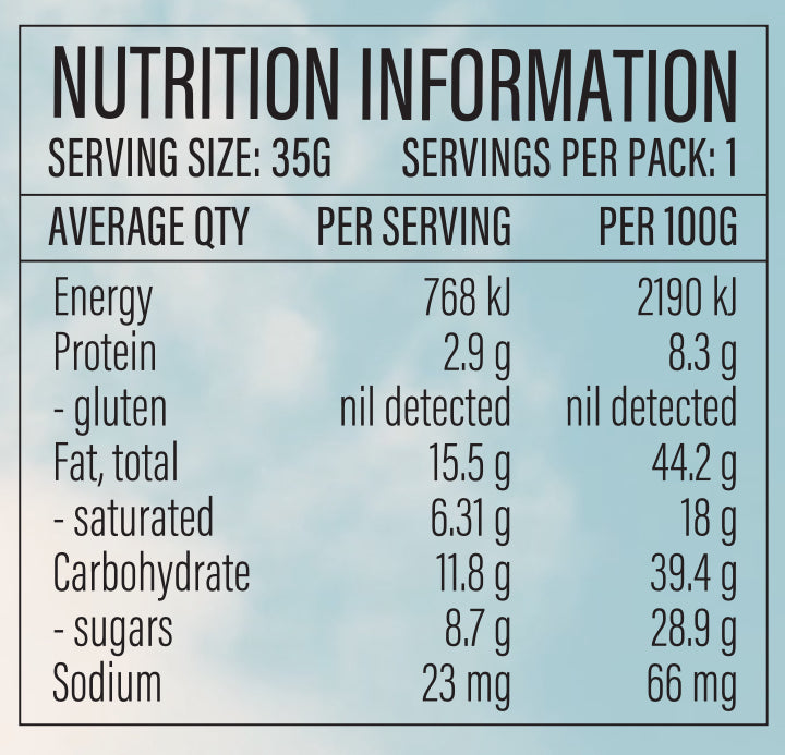 *hazelnut (25.6%), *cacao paste, *coconut blossom sugar, *cacao butter, *gelatinised maca root powder (2%). [Cacao solids 45.5%]. *Organic. Contains: hazelnuts. May be present: sesame, milk, peanut, almond, pecan, macadamia, cashew, pistachio