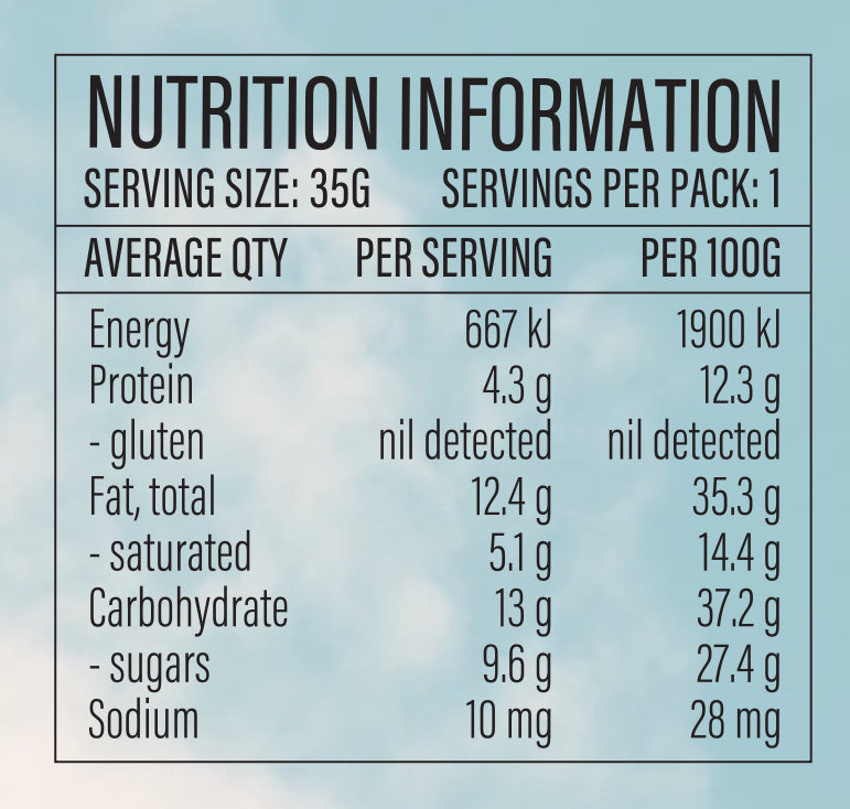 peanuts (36.3%), *cacao paste, *coconut blossom sugar, *cacao butter, *brown rice syrup, *coconut milk, *cacao nibs, wild crafted tremella mushroom powder (Tremella fuciformis) (1%), caramel extract (0.1%), Australian sea salt. [Cacao solids 25%]. *Organic. Contains: peanuts. May be present: sesame, pecan, almond, hazelnut, macadamia, cashew, pistachio.